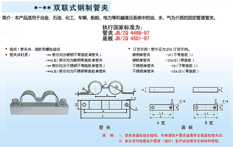 产品特点:双管夹结构简单,安装简便快捷,是管道施工的优良产品。